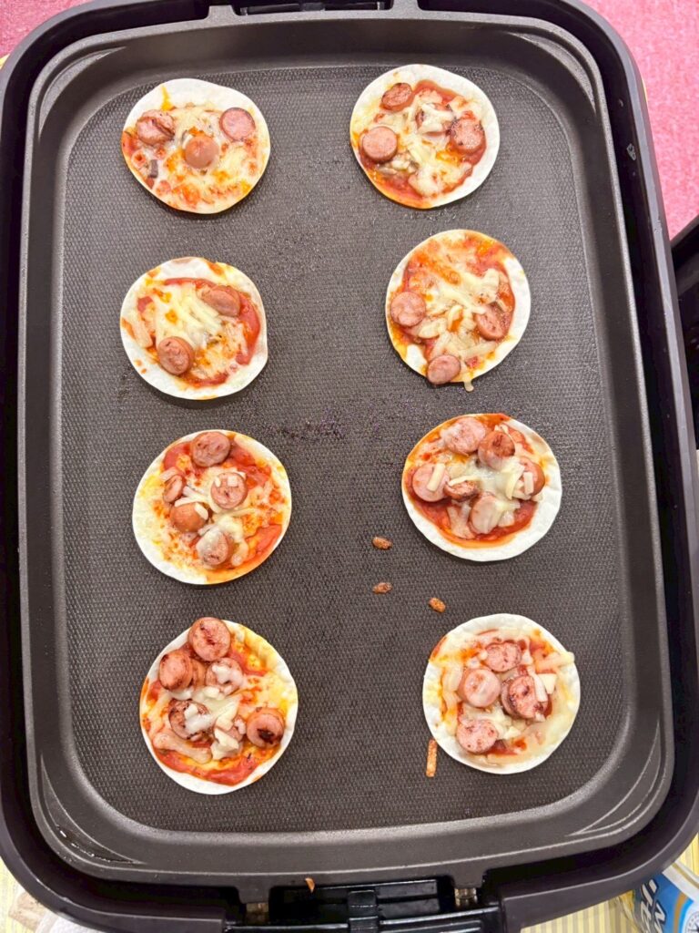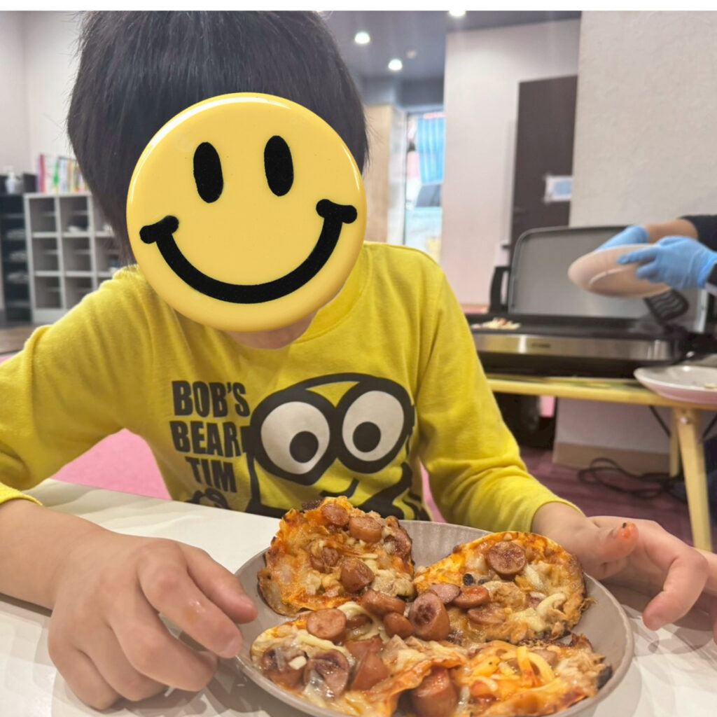 いざ、おやつ作り開始!!包丁の使い方や具材の切り方も指導員の話をしっかりと聞いて上手にできました🔪                      自分たちでピザソースを塗り選んで買った具材を思う存分に乗せるとてんこ盛りになってしまった子もいました🤣🤣                    あとはホットプレートで焼くだけ。                        👦👧「いいにおいしてきた~美味しそう」と完成が待ち遠しい子ども達でした。