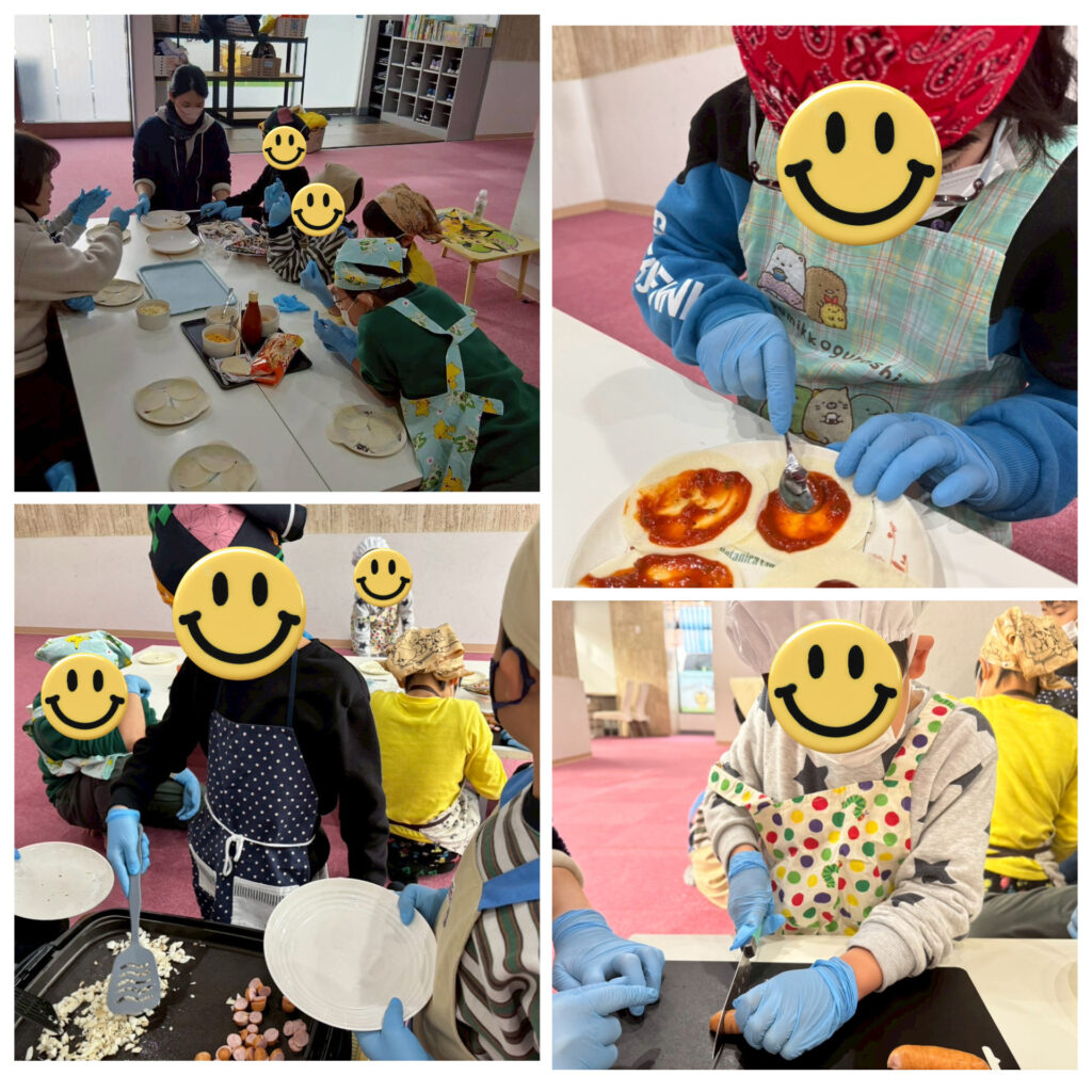 おやつ作りで餃子の皮を使用しピザづくりをおこないました。みんなで買い物からはじめてピザの具材には何が入っているのか話し合いながら購入成功✨
